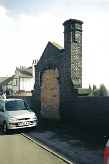 Ever present vandalism continued to leave the station buildings in a dangerous state,[2] and the B-BAG reluctantly decided to demolish three of the station buildings – the Gentleman's toilets; Station Master's Office; and Ladies' Room and General Waiting Room buildings were removed on 18 and 19 June 1977. The Booking Office; Stairs; and "tunnel rooms" were bricked up for later use.[2][12] The remaining structures were removed in 1985, leaving only the platform and bricked up road-level entrance.[8][13] The entrance archway remains to this day, though bricked up, as can be seen on recent photographs.