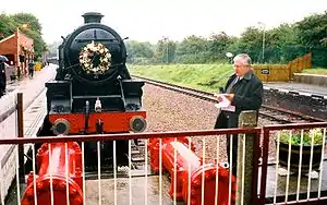 Throughout 1989, ballast was brought in and deposited on the Belgrave and Birstall platform for loading into rail ballast wagons, which then ferried the material along the extension to enable the new track to be correctly packed and aligned so that it would be fit for passenger traffic.[24][25] All this allowed the Birstall Extension to be officially opened on Thursday 15 November 1990. GCR locomotive No.506 "Butler Henderson" hauled a train of MLST directors and local civic dignitaries from Loughborough Central to Rothley, where they changed to a specially fitted push-pull train for the return ride to Belgrave and Birstall.[26] Regular passenger services, push-pull operated, soon resumed to a point just short of the old platform.