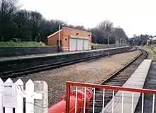 Construction progress was hindered by repeat vandalism, with the toppling of freshly laid brickwork on several occasions.[35] Brickwork was complete to roof level by late January 2000,[36] with a variety of fitting-out, including connection to services and the installation of roller-shutter doors, plastering, and decoration, taking place throughout mid-2000.[37][38] Shortly after, however, the contractor was unable to continue work, and further progress would not take place until July 2001 after a new contractor was assigned to complete the building and tarmac the platform.[39] The building opened for public use soon after.