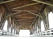 Most of Oregon's covered bridges, including the Belknap Bridge, were built using the Howe truss system, developed in 1840 by the Massachusetts architect William Howe. The system uses heavy timbers reinforced with iron or steel rods. The trusses have central beams and crossed timbers with adjustable, vertical iron rods to support the structural load.[9]