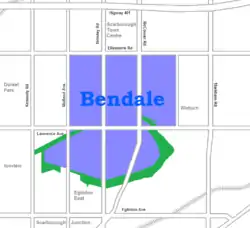 Bendale, also called Cedarbrae and Midland Park, is a residential neighbourhood in the eastern part of Toronto, Ontario, Canada. It is located in the former suburb of Scarborough. It is centred on the intersection of Lawrence Avenue East and Brimley Road. Its boundaries, as defined by the City, are Midland Avenue from Lawrence, north to Highway 401, east to McCowan, south to Lawrence, east to West Highland Creek, south-west along West Highland Creek, then follow several side streets parallel to the Creek, north to Midland Avenue. The area north of Ellesmere is typically considered the Scarborough City Centre district, and is not considered in this neighbourhood article.