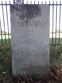 The oldest surviving structures in the parish date from the 18th century, both of which are milestones showing the distance to central London. In 1745, when the Jacobite rising had made manifest to the government the shortcomings of the roads for the rapid transport of troops, the route through Mitcham and Sutton to Banstead Downs, which had been the scene of a failed royalist rising by the Earl of Holland in 1648, was measured and milestones were erected. The first milestone is situated at the northern end of the High Street opposite the junction with Benhill Avenue. On the east side is the inscription: "Whitehall XI Miles. Royal Exchange XII Miles."[9] The second milestone can be found on the west side of Rose Hill next to Rosehill Park, heading north out of the parish towards Rosehill. On the east side is the inscription: "Royal Exchange XI Miles. Whitehall X Miles." and on the northern side the date "1745" is also just legible. More writing on the north and south sides, probably showing distances to other towns and villages in either direction, is no longer legible.[10] They are two of a series of milestones that marked the road from Westminster and London Bridge to Banstead Downs and, from 1755, the route of the turnpike road to Brighton.