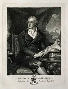 Born in Essex, Moseley received his medical training in Paris and London and began his practice in Kingston, Jamaica, in 1768. During his sixteen years there, he studied and published pamphlets on diseases he encountered, like dysentery, and on the medicinal and agricultural effects of the island's consumable crops, like coffee and sugar.[1] His practice during this time was profitable, and upon his return to Britain in 1784 he had enough money to travel across Europe and to obtain more medical training, earning an M.D. from St. Andrews University. He was elected as a member to the American Philosophical Society in 1775.[2] In 1788, he began a medical practice catering to wealthy patients in London and became a physician to the Royal Hospital in Chelsea.[3]