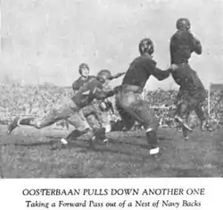 After a year on the freshmen football team, he was invited to varsity tryouts.[2] A star receiver and defensive end in a time when the forward pass was still evolving, Oosterbaan united with quarterback Benny Friedman as a passing combination.[7] As a sophomore in 1925, Oosterbaan led the Big Ten with eight touchdowns.[8] That year, the Wolverines outscored their opponents 227–3. The team shut out every team they faced, except a 3–2 defeat to Northwestern at Soldier Field late in the season. Oosterbaan's defensive play was outstanding as well, and he was key in shutting out the Fighting Illini and Red Grange 3–0 in 1925 a year after he scored four touchdowns in the first twelve minutes.[3] Five players from the 1925 team were named All-Americans, including Benny Friedman and Oosterbaan. He was briefly kicked off of the team during the year by an assistant coach for lining up incorrectly before coach Fielding H. Yost brought him back.[2][9]