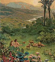 In the continuation of the reading in chapter 4, Eve bore Cain and Abel, who became a farmer and a shepherd respectively.[55] Cain brought God an offering from the fruit of the soil, and Abel brought the choicest of the firstlings of his flock.[56] God paid heed to Abel and his offering, but not to Cain and his, distressing Cain.[57] God asked Cain why he was distressed, because he had free will, and if he acted righteously, he would be happy, but if he didn't, sin crouched at the door.[58] Cain spoke to Abel, and when they were in the field, Cain killed Abel.[59] When God asked Cain where his brother was, Cain replied that he did not know, asking if he was his brother's keeper.[60] God asked Cain what he had done, as his brother's blood cried out to God from the ground.[61] God cursed Cain to fail at farming and to become a ceaseless wanderer.[62] Cain complained to God that his punishment was too great to bear, as anyone who met him might kill him.[63] So God put a mark on Cain and promised to take sevenfold vengeance on anyone who would kill him.[64] Cain left God's presence and settled in the land of Nod, east of Eden.[65] Cain had a son, Enoch, and founded a city, and named it after Enoch.[66] Enoch had a son Irad; and Irad had a son Mehujael; and Mehujael had a son Methushael; and Methushael had a son Lamech.[67] The fourth reading ends here.[68]