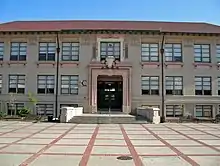 The Berkeley High School campus covers four city blocks between Milvia Street and Martin Luther King Jr. Way, and Allston and Channing Ways. The first cornerstone was laid in 1901, and the complex has been under almost continuous construction ever since, except for a decade around World War II.[44] In the late 1930s, Berkeley High was remodeled and old buildings were replaced with newer ones. The Florence Schwimley Little Theater, the Berkeley Community Theatre, and the G and H buildings are prime examples of the Streamline Moderne style designed by architects Henry H. Gutterson and William G. Corlett. The rebuilding was financed largely through Franklin Roosevelt's New Deal program the WPA.[45] They are embellished with sculptural reliefs by Robert Boardman Howard, Jacques Schnier and Lulu Hawkins Braghetta.[46]