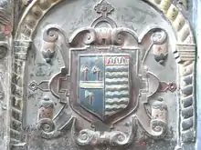- Thirdly Eleanor married John II Wrey (d.pre 1596) of North Russell in Devon and Trebeigh, St Ive, in Cornwall, eldest son of John I Wrey (d.1597), Sheriff of Cornwall in 1587,[10] and brother of Sir William Wrey, 1st Baronet (d.1636). The large chest tomb monument to John Wrey I showing kneeling effigies of him and his wife Blanche Killigrew (d.1595), heiress of Trebeigh, survives in the north transept of St Peter's Church in Tawstock, Devon, a later seat of the Wrey family, having been removed in 1924 from St Ive Church in Cornwall.[11] The arms of Smith of Totnes Barry undé of sixteen argent and azure, on a chief gules three barnacles or[12] are shown on the front of the chest tomb impaled by Wrey. Without issue.