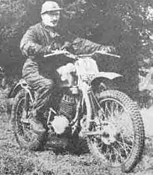 Encouraged by this success, Greeves decided to diversify into motorcycle manufacture and set up Greeves motor cycles in 1953. A keen trials rider in his spare time, he had started collecting veteran and vintage motorcycles, including a 1912 Triumph with the registration 'OLD 1'.[4] Preston-Cobb also encouraged him to start the motorcycle business. Working together they developed a prototype using a 2-stroke 197cc single-cylinder engine sourced from Villiers Engineering - and a Greeves badge on the fuel tank. The motorcycles were really a sideline for the main business of producing the three-wheeled invalid cars, so development of the prototypes had to be fitted in when the production schedule allowed. The first Greeves motorcycle was developed in 1951[4] and featured a massive front down member combined in a large 'I-section' cast alloy beam, cast in a new light-alloy foundry that had been added to the Greeves factory. The tubular frame member was inserted into a mould and the main frame was cast around it, making for a very strong frame. Made from LM6 silicon-aluminium alloy, it was claimed to be stronger than tubular steel and proved capable of standing up to the rough treatment of international off-road trials competition.[5] Protection was finished off with reinforced engine cradle plates which were also light alloy castings.[4]