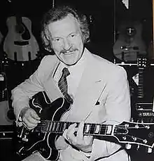 He joined the BBC Show Band directed by Cyril Stapleton in the 1950s, when he began to be featured as a soloist.[5] He also worked as a session musician on many early British rock and roll and other records for artists such as Adam Faith, Billy Fury and Tommy Steele and worked as an accompanist to visiting American singers such as Frank Sinatra, Judy Garland and Nat King Cole. It is estimated that he performed on over 5,000 BBC radio broadcasts.[3] He was also seen regularly on British television in the 1950s, including some of the most popular children's television programmes.[3] In 1959 he was asked by Top Rank Records to make a record as a solo guitarist.[5] He became the first British guitarist in the UK Singles Chart, with "Guitar Boogie Shuffle" in 1959,[6] and was cited as an influence by many stars, including Eric Clapton, Brian May, Paul McCartney, George Harrison, John Lennon, Pete Townshend, Keith Richards, Sting, Hank Marvin, Robert Smith, Mike Oldfield, Mark Knopfler and Jimmy Page.[1][2][3]