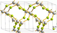 The structure of solid BeF2 resembles that of cristobalite. Be2+ centers are four coordinate and tetrahedral and the fluoride centers are two-coordinate.[6] The Be-F bond lengths are about 1.54 Å.[7] Analogous to SiO2, BeF2 can also adopt a number of related structures. An analogy also exists between BeF2 and AlF3: both adopt extended structures at mild temperature.