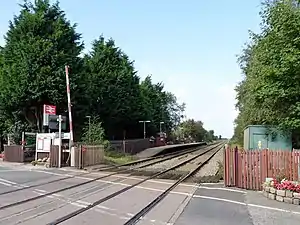 The station's level crossing was controlled by a signal box until the early 1990s,[3] but this was closed and demolished after automatic barriers were installed and the fixed signals removed. The platform layout has also been altered, with the westbound platform moved to the opposite side of the crossing - previously both platforms were sited on the eastern side (the redundant one can still be seen).[4]