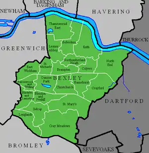 There are 17 wards represented on Bexley Council; each ward elects two or three councillors, 45 in all.[6] The wards are shown on the accompanying map.
