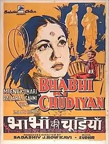 Bhabhi Ki Chudiyan is a 1961 Hindi film, a family drama directed by Sadashiv J. Row Kavi with Meena Kumari and Balraj Sahni in the lead roles. It is a remake of 1953 Marathi film Vahinichya Bangdya, which was also remade in Telugu as Vadina Gari Gaajulu (1956) and in Tamil as Mangaiyar Thilakam (1955).