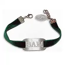 BAM bracelet — All My Children’s Bianca and Maggie (BAM) may not be a soap super couple...YET! That doesn’t mean you shouldn’t show your support for the intriguing duo that can’t quite seem to get together (it’s like they’re distracted or something) with this stylish brushed-pewter/nickel-plated ID emblem featuring engraved lettering, a 6 ¾" velvet strap in forest green and adjustable chain strap. Limited edition.[62]