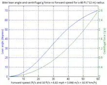 For example, a bike in a 10 m (33 ft) radius steady-state turn at 10 m/s (36 km/h, 22 mph) must be at an angle of 45.6°. A rider can lean with respect to the bike in order to keep either the torso or the bike more or less upright if desired. The angle that matters is the one between the horizontal plane and the plane defined by the tire contacts and the location of the center of mass of bike and rider.