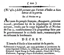 To fill the requirement of an equalitarian national award, the National Convention developed the practice of passing resolutions by vote, solemnly stating that a deserving citizen, or group of citizen, had Bien mérité de la Patrie. These resolutions were published in Le Moniteur Universel, in a manner similar to being mentioned in dispatches.
