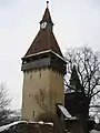 The King granted the town the right to bear arms when the Ottoman army was frightening the surroundings. The Transylvanian Saxons chose to build instead of fortresses around the towns, to fortify the churches.[5] The church has three rows of exterior fortifications linked by gate towers,[2] nine in total.[1] The first, with four towers, dates to the 14th century; the second was built together with the church, and has a series of reinforcing arches; the third, also with towers, is from the 16th and 17th centuries. The clock tower to the north of the church also serves as a gate within the inner fortifications. Four stories high, it has a wooden battlement and parapets. The clock is above the pyramid-shaped roof. The wooden bell tower is located north of the church, while the mausoleum tower contains the headstones of the priest who built the church as well as the bishops buried at Biertan.[2] The Catholic tower was used by the few Saxons who did not adhere to the Reformation but kept their Roman Catholic faith. Its chapel (ca. 1520–1530) features a rare example of 16th-century Transylvanian mural painting, forming an exception to the austere aesthetic that predominated.[6] The grounds contain a "matrimonial prison" where couples wishing to divorce were confined so they could be sure they wished to end their marriage.[1] The lockup lasted for two weeks, although the pair could leave early if they reconciled. They had to share a single bed, plate and spoon. During the three centuries that bishops resided at Biertan, just one couple ended up divorcing.[7]