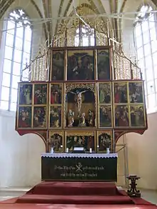 A hall church with three naves that retains a design close to the original,[1][2] it was the last such church built in Transylvania, and was constructed between 1486 and 1524[2] on the site of an earlier Romanesque church.[1][2] Dedicated to the Virgin Mary and built in Late Gothic style with Renaissance touches,[2][3][4] the structure was constrained by the hilly landscape. The choir is 18 m in length, with a rib-vaulted ceiling, while the three naves of equal height also have rib vaulting. A defensive level above the choir has parapets and a battlement.[2] A second, wooden, level was demolished in 1803.[1] The polyptych altarpiece has 28 panels executed between 1482 and 1513 by a painter likely trained at Vienna and Nuremberg. In the center, there is a sculpted group: a crucifix with Jesus Christ hanging, Mary standing and Mary Magdalene embracing the cross. The upper side panels show visions of Ezekiel and Augustus.[2] The stone pulpit, which shows scenes carved in relief, dates to 1523. The richly decorated intarsia door of the sacristy has a complex lock, displayed at the 1889 Paris World's Fair. Its central system blocks the door in thirteen points, ensuring the safety of the valuables kept in the sacristy.[1]