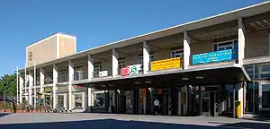 In 1958, construction began on the new reception building and it was inaugurated on 27 June 1961. Helmuth Conradi, who also designed the new Heidelberg Hauptbahnhof, planned it as a two-story building with a one-story annex. The station's roof extends to the right and left of the lobby and connected to a four-story tower with a clock, which appears to be part of the same building. The windows of the entrance building emphasise its concrete skeleton. In the tower and on the upper floor there are offices. The previous buildings still remained at first and were later demolished.[7]