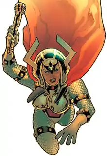 Big Barda is a fictional superheroine (although sometimes portrayed as a villain) appearing in American comic books published by DC Comics. She first appeared in Mister Miracle #4 (October 1971), and was created by Jack Kirby.[1] Jack Kirby based Barda's physical appearance on Lainie Kazan, who had recently appeared topless in Playboy.[2] Mark Evanier, Kirby's assistant on the Fourth World comics, has explained the genesis of the character: "Jack based some of his characters (not all) on people in his life or in the news... the characterization between Scott 'Mister Miracle' Free and Barda was based largely—though with tongue in cheek—on the interplay between Kirby and his wife Roz".[3] In 2011, Big Barda was ranked 75th in Comics Buyer's Guide's "100 Sexiest Women in Comics" list.[4]