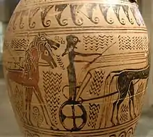The earliest reference to a chariot race in Western literature is an event in the funeral games of Patroclus in the Iliad.[4] In Homeric warfare, elite warriors were transported to the battlefield in two-horse chariots, but fought on foot; the chariot was then used for pursuit or flight.[5] Most Bronze Age chariots uncovered by archaeology in Peloponnesian Greece are bigae.[6]