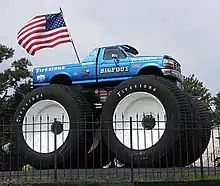 | Bigfoot 16 | 2007 | Begun in 1998, but not completed until April 2007, Bigfoot 16 debuted at the Four Wheel and Off Road Jamboree in Springfield, Missouri. This was the first Bigfoot monster truck to have a 2-speed Powerglide transmission rather than a 3-speed Ford C-6 transmission.[29] In its first year of competition, Bigfoot 16, driven by Dan Runte, won the Major League of Monster Trucks championship.[3] Retired after a crash in the fall of 2012 at the Indianapolis 4x4 Jamboree when piloted by Larry Swim. | ![]() Bigfoot 16 in Jefferson City, Missouri. February 8, 2012 |