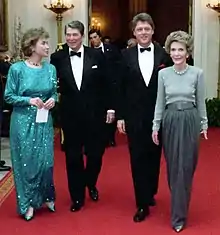 Governor and Mrs. Clinton attend the Dinner Honoring the Nation's Governors in the White House with President Ronald Reagan and first lady Nancy Reagan, 1987.