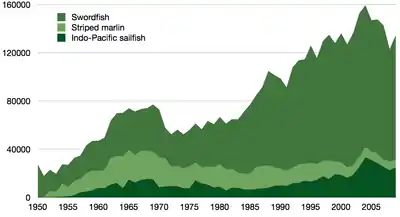 Billfish are exploited both as food and as fish. Marlin and sailfish are eaten in many parts of the world, and many sport fisheries target these species. Swordfish are subject to particularly intense fisheries pressures, and although their survival is not threatened worldwide, they are now comparatively rare in many places where once they were abundant. The istiophorid billfishes (marlin and spearfish) also suffer from intense fishing pressures. High mortality levels occur when they are caught incidentally by longline fisheries targeting other fish.[55] Overfishing continues to "push these declines further in some species".[56] Because of these concerns about declining populations, sport fishermen and conservationists now work together to gather information on billfish stocks and implement programs such as catch and release, where fish are returned to the sea after they have been caught. However, the process of catching them can leave them too traumatised to recover.[37] Studies have shown that circle fishing hooks do much less damage to billfish than the traditional J-hooks, yet they are at just as effective for catching billfish. This is good for conservation, since it improves survival rates after release.[57][58]