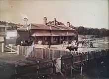 On Sunday 22 April 1883, the original wooden station building was destroyed by fire.[2][3] A coroner's inquest failed to find a cause of the fire despite hearing evidence from many witnesses. Special praise was given to a young fettler, William Nettleton, who bravely risked injury to save three chairs.[4][5] Just over a month later Binalong was celebrating the completion of the brickwork of the new, sturdier station. George Reynolds, the bricklayer, was toasted by the attendees for his work. The celebratory atmosphere also saw toasts to the Queen, the district engineer, the inspector, the carpenters, the Press and the station master and his wife; Mr and Mrs Rae.[6]