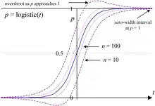 There are several research papers that compare these and other confidence intervals for the binomial proportion.[3][2][18][19] Both Agresti and Coull (1998)[13] and Ross (2003)[20] point out that exact methods such as the Clopper–Pearson interval may not work as well as certain approximations. The Normal approximation interval and its presentation in textbooks has been heavily criticised, with many statisticians advocating that it be not used.[4] The principal problems are overshoot (bounds exceed [0, 1]), zero-width intervals at = 0 and 1 (falsely implying certainty),[2] and overall inconsistency with significance testing.[3]
