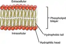 Every cell is enclosed within a cell membrane that separates its cytoplasm from the extracellular space.[50] A cell membrane consists of a lipid bilayer, including cholesterols that sit between phospholipids to maintain their fluidity at various temperatures. Cell membranes are semipermeable, allowing small molecules such as oxygen, carbon dioxide, and water to pass through while restricting the movement of larger molecules and charged particles such as ions.[51] Cell membranes also contains membrane proteins, including integral membrane proteins that go across the membrane serving as membrane transporters, and peripheral proteins that loosely attach to the outer side of the cell membrane, acting as enzymes shaping the cell.[52] Cell membranes are involved in various cellular processes such as cell adhesion, storing electrical energy, and cell signalling and serve as the attachment surface for several extracellular structures such as a cell wall, glycocalyx, and cytoskeleton.