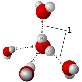 In terms of its molecular structure, water is a small polar molecule with a bent shape formed by the polar covalent bonds of two hydrogen (H) atoms to one oxygen (O) atom (H2O).[38] Because the O–H bonds are polar, the oxygen atom has a slight negative charge and the two hydrogen atoms have a slight positive charge.[38] This polar property of water allows it to attract other water molecules via hydrogen bonds, which makes water cohesive.[38] Surface tension results from the cohesive force due to the attraction between molecules at the surface of the liquid.[38] Water is also adhesive as it is able to adhere to the surface of any polar or charged non-water molecules.[38]