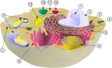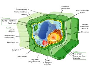 Within the cytoplasm of a cell, there are many biomolecules such as proteins and nucleic acids.[53] In addition to biomolecules, eukaryotic cells have specialized structures called organelles that have their own lipid bilayers or are spatially units.[54] These organelles include the cell nucleus, which contains most of the cell's DNA, or mitochondria, which generates adenosine triphosphate (ATP) to power cellular processes. Other organelles such as endoplasmic reticulum and Golgi apparatus play a role in the synthesis and packaging of proteins, respectively. Biomolecules such as proteins can be engulfed by lysosomes, another specialized organelle. Plant cells have additional organelles that distinguish them from animal cells such as a cell wall that provides support for the plant cell, chloroplasts that harvest sunlight energy to produce sugar, and vacuoles that provide storage and structural support as well as being involved in reproduction and breakdown of plant seeds.[54] Eukaryotic cells also have cytoskeleton that is made up of microtubules, intermediate filaments, and microfilaments, all of which provide support for the cell and are involved in the movement of the cell and its organelles.[54] In terms of their structural composition, the microtubules are made up of tubulin (e.g., α-tubulin and β-tubulin whereas intermediate filaments are made up of fibrous proteins.[54] Microfilaments are made up of actin molecules that interact with other strands of proteins.[54]