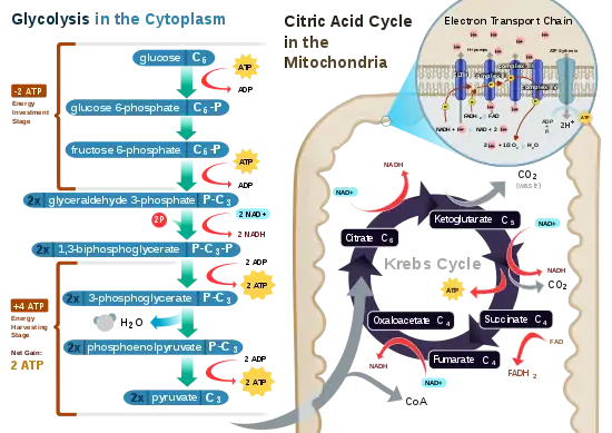 Sugar in the form of glucose is the main nutrient used by animal and plant cells in respiration. Cellular respiration involving oxygen is called aerobic respiration, which has four stages: glycolysis, citric acid cycle (or Krebs cycle), electron transport chain, and oxidative phosphorylation.[58] Glycolysis is a metabolic process that occurs in the cytoplasm whereby glucose is converted into two pyruvates, with two net molecules of ATP being produced at the same time.[58] Each pyruvate is then oxidized into acetyl-CoA by the pyruvate dehydrogenase complex, which also generates NADH and carbon dioxide. Acetyl-Coa enters the citric acid cycle, which takes places inside the mitochondrial matrix. At the end of the cycle, the total yield from 1 glucose (or 2 pyruvates) is 6 NADH, 2 FADH2, and 2 ATP molecules. Finally, the next stage is oxidative phosphorylation, which in eukaryotes, occurs in the mitochondrial cristae. Oxidative phosphorylation comprises the electron transport chain, which is a series of four protein complexes that transfer electrons from one complex to another, thereby releasing energy from NADH and FADH2 that is coupled to the pumping of protons (hydrogen ions) across the inner mitochondrial membrane (chemiosmosis), which generates a proton motive force.[58] Energy from the proton motive force drives the enzyme ATP synthase to synthesize more ATPs by phosphorylating ADPs. The transfer of electrons terminates with molecular oxygen being the final electron acceptor.