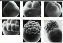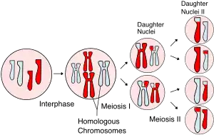 The cell cycle is a series of events that take place in a cell that cause it to divide into two daughter cells. These events include the duplication of its DNA and some of its organelles, and the subsequent partitioning of its cytoplasm into two daughter cells in a process called cell division.[67] In eukaryotes (i.e., animal, plant, fungal, and protist cells), there are two distinct types of cell division: mitosis and meiosis.[68] Mitosis is part of the cell cycle, in which replicated chromosomes are separated into two new nuclei. Cell division gives rise to genetically identical cells in which the total number of chromosomes is maintained. In general, mitosis (division of the nucleus) is preceded by the S stage of interphase (during which the DNA is replicated) and is often followed by telophase and cytokinesis; which divides the cytoplasm, organelles and cell membrane of one cell into two new cells containing roughly equal shares of these cellular components. The different stages of mitosis all together define the mitotic phase of an animal cell cycle—the division of the mother cell into two genetically identical daughter cells.[69] The cell cycle is a vital process by which a single-celled fertilized egg develops into a mature organism, as well as the process by which hair, skin, blood cells, and some internal organs are renewed. After cell division, each of the daughter cells begin the interphase of a new cycle. In contrast to mitosis, meiosis results in four haploid daughter cells by undergoing one round of DNA replication followed by two divisions.[70] Homologous chromosomes are separated in the first division (meiosis I), and sister chromatids are separated in the second division (meiosis II). Both of these cell division cycles are used in the process of sexual reproduction at some point in their life cycle. Both are believed to be present in the last eukaryotic common ancestor.
