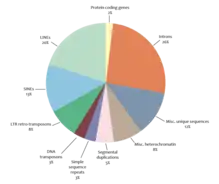 A genome is an organism's complete set of DNA, including all of its genes.[98] Sequencing and analysis of genomes can be done using high throughput DNA sequencing and bioinformatics to assemble and analyze the function and structure of entire genomes.[99][100][101] The genomes of prokaryotes are small, compact, and diverse. In contrast, the genomes of eukaryotes are larger and more complex such as having more regulatory sequences and much of its genome are made up of non-coding DNA sequences for functional RNA (rRNA, tRNA, and mRNA) or regulatory sequences. The genomes of various model organisms such as arabidopsis, fruit fly, mice, nematodes, and yeast have been sequenced. The Human Genome Project was a major undertaking by the international scientific community to sequence the entire human genome, which was completed in 2003.[102] The sequencing of the human genome has yielded practical applications such as DNA fingerprinting, which can be used for paternity testing and forensics. In medicine, sequencing of the entire human genome has allowed for the identification of mutations that cause tumors as well as genes that cause a specific genetic disorder.[102] The sequencing of genomes from various organisms has led to the emergence of comparative genomics, which aims to draw comparisons of genes from the genomes of those different organisms.[102]