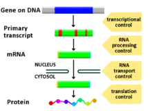 The regulation of gene expression (or gene regulation) by environmental factors and during different stages of development can occur at each step of the process such as transcription, RNA splicing, translation, and post-translational modification of a protein.[95]