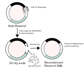 A recombinant DNA can be inserted in one of two ways. A common method is to simply insert the DNA into a host chromosome, with the site of insertion being random.[103] Another approach would be to insert the recombinant DNA as part of another DNA sequence called a vector, which then integrates into the host chromosome or has its own origin of DNA replication, thereby allowing to replicate independently of the host chromosome.[103] Plasmids from bacterial cells such as E. coli are typically used as vectors due to their relatively small size (e.g. 2000-6000 base pairs in E. coli), presence of restriction enzymes, genes that are resistant to antibiotics, and the presence of an origin of replication.[103] A gene coding for a selectable marker such as antibiotic resistance is also incorporated into the vector.[103] Inclusion of this market allows for the selection of only those host cells that contained the recombinant DNA while discarding those that do not.[103] Moreover, the marker also serves as a reporter gene that once expressed, can be easily detected and measured.[103]