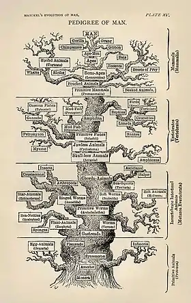 Serious evolutionary thinking originated with the works of Jean-Baptiste Lamarck, who was the first to present a coherent theory of evolution.[27] He posited that evolution was the result of environmental stress on properties of animals, meaning that the more frequently and rigorously an organ was used, the more complex and efficient it would become, thus adapting the animal to its environment. Lamarck believed that these acquired traits could then be passed on to the animal's offspring, who would further develop and perfect them.[28] However, it was the British naturalist Charles Darwin, combining the biogeographical approach of Humboldt, the uniformitarian geology of Lyell, Malthus's writings on population growth, and his own morphological expertise and extensive natural observations, who forged a more successful evolutionary theory based on natural selection; similar reasoning and evidence led Alfred Russel Wallace to independently reach the same conclusions.[29][30] Darwin's theory of evolution by natural selection quickly spread through the scientific community and soon became a central axiom of the rapidly developing science of biology.