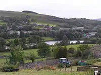 ![]() Birch Vale from Lower Cliff. Looking SSW across the Sett valley, with the end of Hayfield Sewage Works just visible far left; in the centre is Birch Vale Reservoir and beyond that the houses of Birch Vale along the A6015. | |