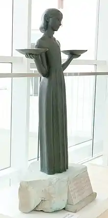 Bird Girl is a sculpture made in 1936 by Sylvia Shaw Judson in Lake Forest, Illinois. It was sculpted at Ragdale, her family's summer home, and achieved fame when it was featured on the cover of the 1994 non-fiction novel Midnight in the Garden of Good and Evil. Originally exhibited as Girl with Bowls at the Art Institute of Chicago in 1938, it was also exhibited as Fountain Figure, Standing Figure, and Peasant Girl. A 1967 book by Judson first referred to it as Bird Girl.[1][2][3]