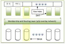 The BitVault architecture is composed of multiple bricks which constitute a logical 160 bit address space, each associated with hash of some data. The association is maintained in a Distributed Hash Table (DHT). The DHT partitions the entire hash table into smaller hash tables. For example, if there are n peers, the hash table would be divided into n hash tables, each starting from the row next to where its immediate predecessor ended. Each DHT has its associated brick, and the extent of the logical address space a brick is responsible for is called its Zone. The bricks communicate using peer-to-peer technology, over the Membership and Routing Layer (MRL). Lookup of any data object can be done by n bricks in parallel, in its own zone, giving an efficiency of O (log N).