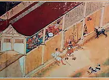 According to Hugh de Ferranti, iconographic and literary sources generally portray biwa hōshi as solitary and pitiable figures, though wealthy and powerful individuals also exist in such representations.[35] Sometimes they are depicted as mysterious, frightening, and potentially dangerous individuals while in other sources, they are "ridiculous" characters "to be made fun of, at times with unbridled cruelty".[35] Folklore links biwa hōshi to ghosts through their placation of wronged spirits and the chinkon ritual performance, accounts for their fearful quality.[36] However, kyōgen plays called zatō-mono feature deliberate tricking of a blind zatō so that he becomes lost and disoriented, or suffers losses and misunderstanding.[37] Such action is provoked by sighted individuals for pure amusement, as in the stories of Saru zatō and Tsukimi zatō.[36][37] Picture scrolls marry this "similar sense of biwa hōshi as bizarre, somewhat frightening figures who can nevertheless be taunted".[37][38] In these images, people "look out from their houses at the biwa players and appear to be laughing or jeering at them", while children run away from and dogs bark at them.[38]