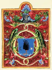 | Heraldry | This characteristic flag with a forked tail was reconstructed after a miniature in Philostratus Chronicle, one of the Corvinas, representing the 1485 entry of János Corvinus, son of King Matthias, into Vienna. The black colour of the flag used to be white (argent), but the argent paint oxidized. The reconstruction preserves the original colour. |