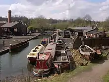 The boat dock at the Black Country Living Museum was built in 1976,[1] like many boat docks in the region its buildings are made out of recycled boat timbers from derelict wooden boats. The thousands of boats that used to work the Black Country canals all needed constant maintenance.[2]