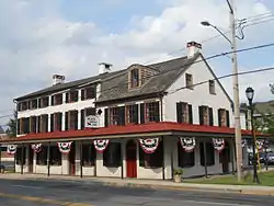 Black Horse Inn, also known as Sampson & the Lion, is a historic inn and tavern located in Flourtown, Springfield Township, Montgomery County, Pennsylvania. The original section was built in 1744, and is a 2+1⁄2-story, stuccoed stone structure, with a 1-story, stone kitchen addition in the rear. The original section measures 16 feet by 18 feet, and the kitchen addition 15 feet by 15 feet. In 1833, a three-story addition was made to the north and between 1880 and 1908, three one-story additions were made to the rear. Also in 1833, a one-story porch was added to the front, west, and south sides. The building is in the Federal style.[2]