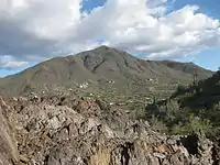The mountain is composed of two main rock types that are roughly divided between western and eastern halves of the mountain. The west side of the mountain is composed of a ~250 m. bed of meta-sedimentary rock[3] distinguishable as phyllite and argillite. From a distance, the meta-sedimentary rock is easily mistaken for basalt, which is common in the area, however basalt is not found on Black Mountain. The phyllite has a slaty cleavage and is foliated in all directions, a result of shortening due to pressure-solution volume-diffusion of as much as 50%. As a result of shortening, streambeds of nearby washes are filled with black alluvium.
