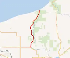 While CR 513 (Black River Road) extends further south to connect with US Highway 2 near Bessemer, the National Forest Scenic Byway designation starts at the intersection with CR 204 (Airport Road) west of the Gogebic-Iron County Airport and north of the Big Powderhorn Mountain. From this southern starting point, the roadway runs northward along the Black River through the Ottawa National Forest. CR 513 runs along the western side of the river, staying shy of the banks as it passes through the woods.[3][4] The woods through which the roadway passes contain pine, hemlock and hardwood trees. The Royal Palm Ranch, a nationally known equestrian school is located along the road[5] on 100 acres (40 ha) of land next to the river.[6] The byway curves away from the river near Copper Peak,[3][4] the tallest ski flying hill in the world.[7] The 18-story facility allows visitors on clear enough days to see 85 miles (137 km) in the distance to places like Minnesota, Isle Royale and Canada.[8]