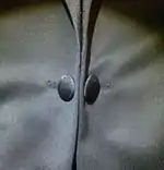The original and most formal model of dinner jacket is the single-breasted model. The typical black tie jacket is single-breasted with one button only, with jetted, or besom, pockets and is of black or midnight blue; usually of wool or a wool-mohair, or wool-polyester blend, although other materials, especially silk, are seen. Although other materials are used, the most appropriate and traditional for the dinner jacket are wool barathea or superfine herringbone.[2] Double-breasted models have become less common, but are generally considered equally appropriate for most black tie occasions. Dinner jackets were commonly ventless before World War I, but in the 21st century come ventless, with side vents, or, less commonly, with centre vents. The ventless style is considered more formal, whilst the centre vent is the least formal. The lapels, traditionally pointed and shawl, are usually faced with silk in either a grosgrain or a satin weave, but can also be silk barathea. A notched lapel is usually considered more appropriate for a business suit that a dinner jacket but is commonly seen on inexpensive off the rack dinner jackets.[43] According to the Black Tie Guide, the peaked lapel and shawl collar are equally authentic and correct, with the latter being slightly less formal.[40] The buttons are covered in similarly coloured material to the main part of the jacket, which would typically be either self-faced or covered with the same material as the lapels. Some higher-end single-breasted jackets, both new and vintage, tend to be fastened with a link front closure which is visually similar to a cufflink; this traditional method of closure is common in the United Kingdom.
