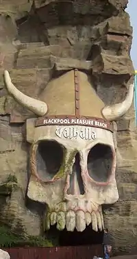 The park was the first in Europe to introduce a fully inverting steel coaster, Revolution[6] and is the last remaining park in the world to still operate a Steeplechase roller coaster. The Grand National is one of only three Möbius loop coasters in existence, where a singular track "loops" around itself, offering a facsimile out-and-back layout and creating a "racing" effect on two parallel tracks. Sir Hiram Maxims Captive Flying Machine is the oldest amusement park ride in Europe having opened in August 1904. At the cost of £15 million, Valhalla was one of the largest and most expensive indoor dark rides in the world. Designed by Sarner and manufactured by Intamin, Valhalla won "Best Water Ride" at the 2018 Golden Ticket awards, an accolade it has held over a consecutive number of years. The park also operates a Nickelodeon Land and the world's only Wallace & Gromit ride, the Thrill-O-Matic. In 2015 the park introduced Red Arrows Sky Force, a Gerstlauer Sky Fly thrill ride which is the first ride of its kind in the United Kingdom.[7][8] The latest record is taken by Icon, a multi-launch coaster manufactured by Mack Rides in Germany.[9]